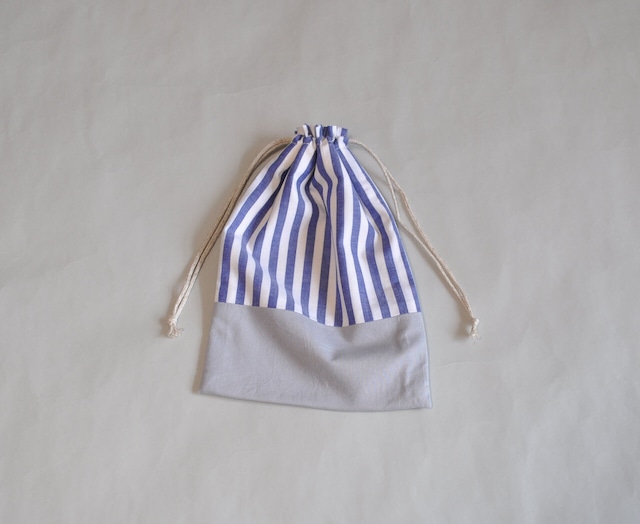 Baton de nuuno (バトンデヌウノ)ブルーストライプ 巾着 給食セット(こども用お箸やランチョンマット)が入るサイズの巾着です。 リップや大事なもの入れなどとしても使えます。 ブルーのストライプに無地のグレーを合わせた、 シンプルなデザインです。 裏地は、無地の生成生地になります。 素材 : コットン100% サイズ:タテ約24cm・ヨコ約17cm ・ひとつひとつ丁寧に作っていますがハンドメイド品の為、少々の色の濃淡・個体差などがあります。 ・洗いをかけてない生地もあります。多少の縮みが生じる場合があります。 ・記載サイズは目安になります。多少の個体差は生じます。