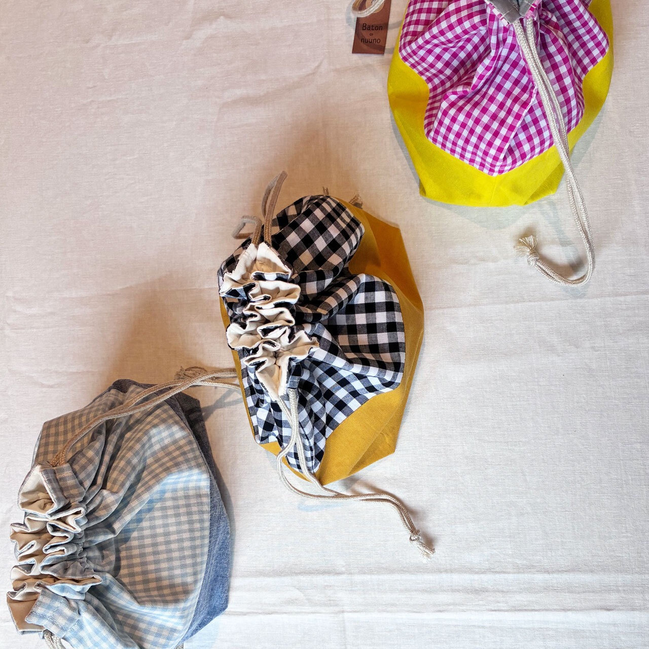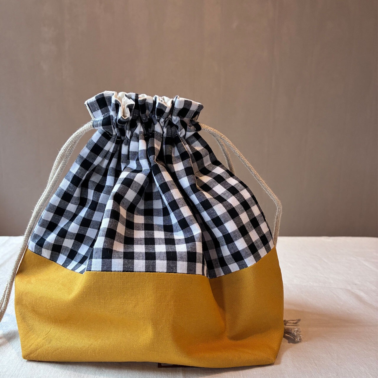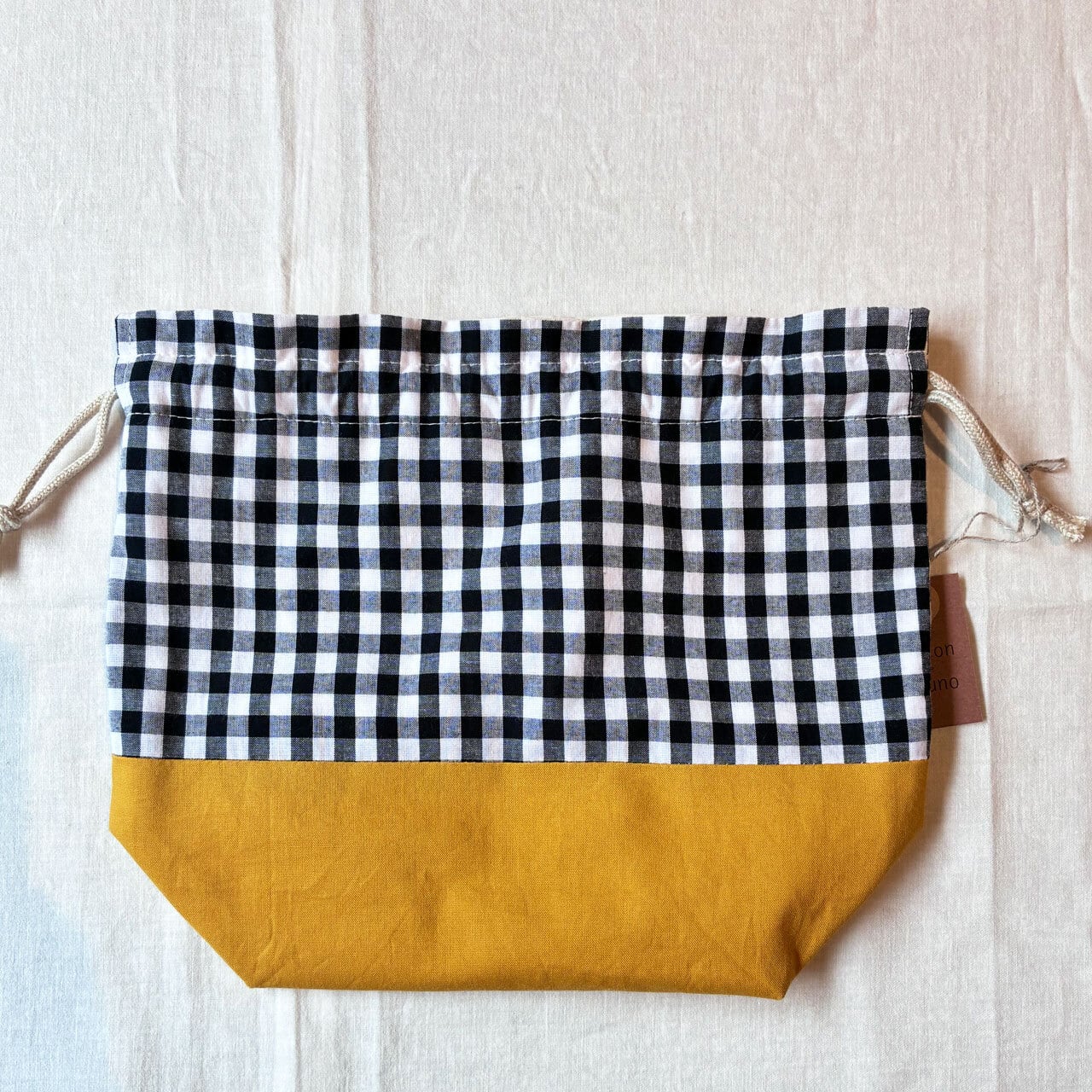 黒のギンガムチェックとマスタードの組み合わせがナチュラルな印象の巾着です。