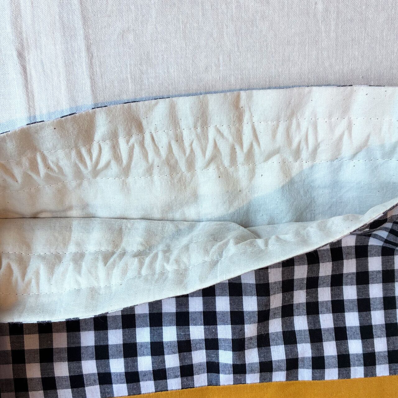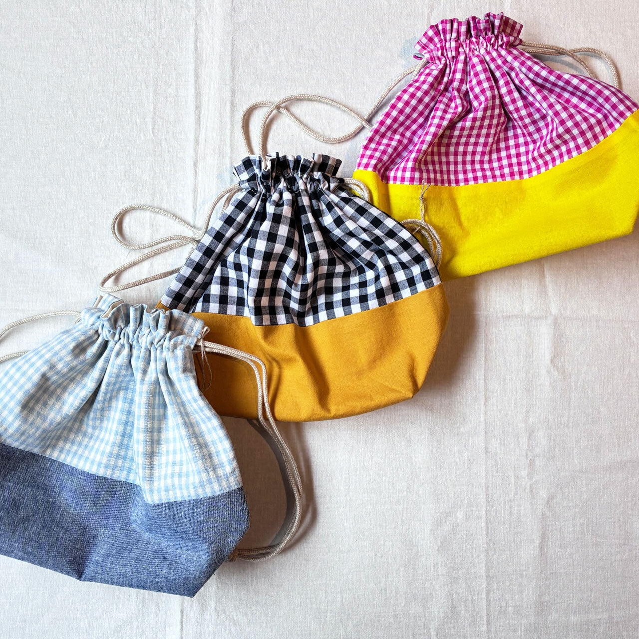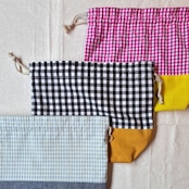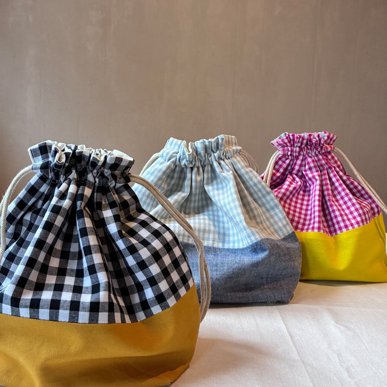 黒のギンガムチェックとマスタードの組み合わせがナチュラルな印象の巾着です。